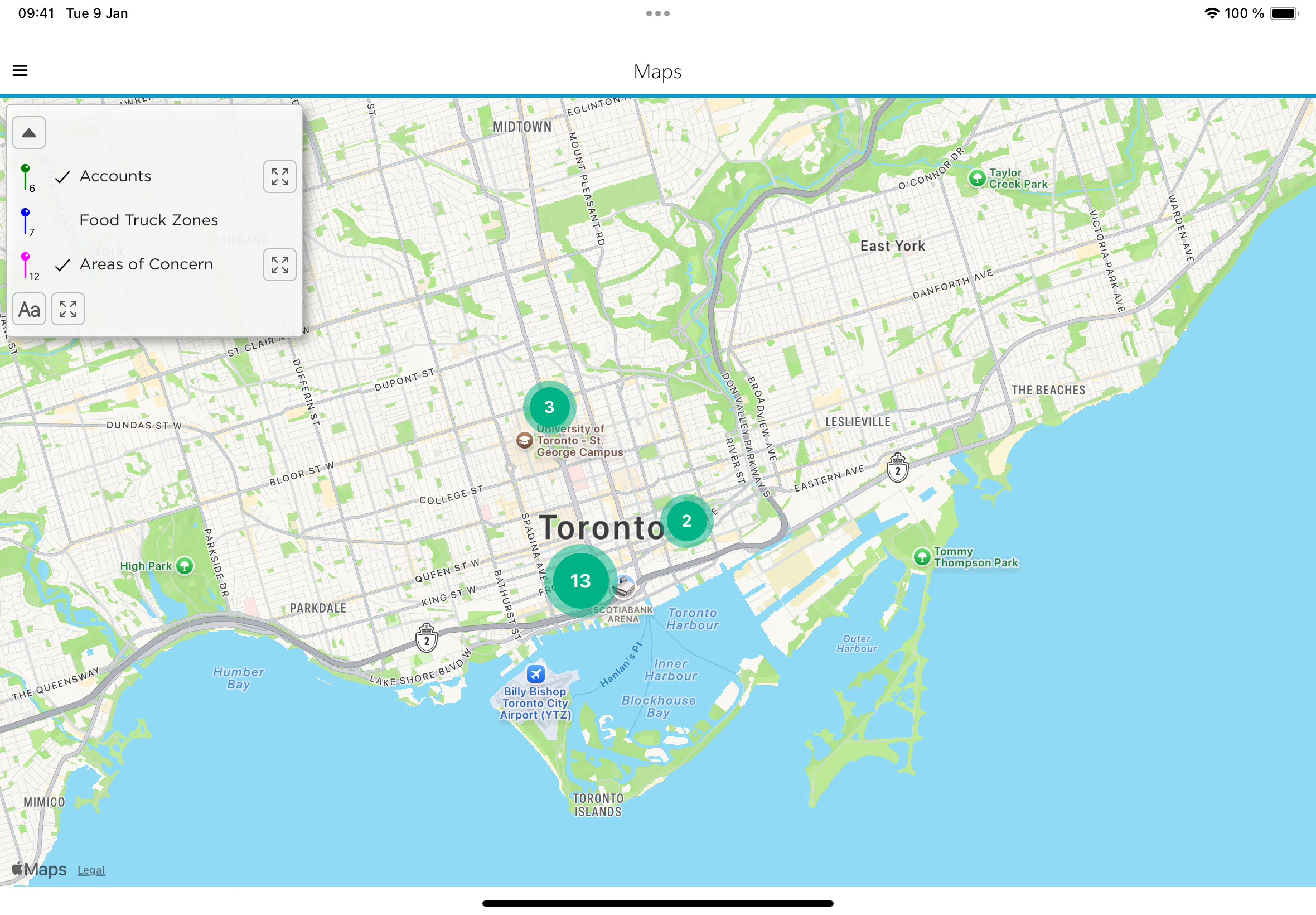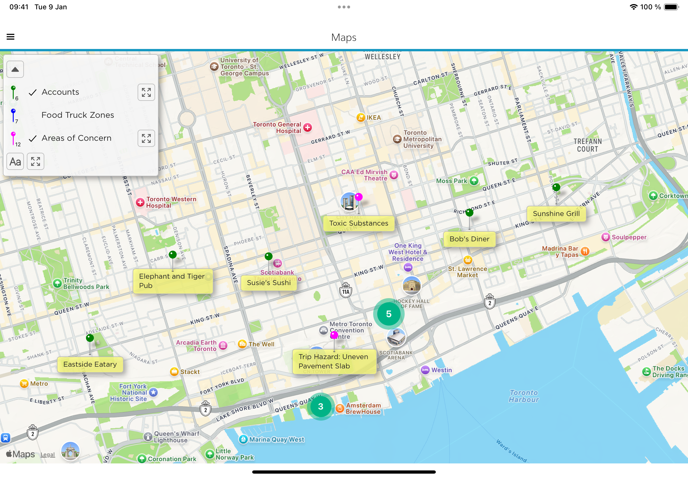 Figure 1 - Map View Showing Clustering Of Pins Representing Accounts and Areas Of Concern